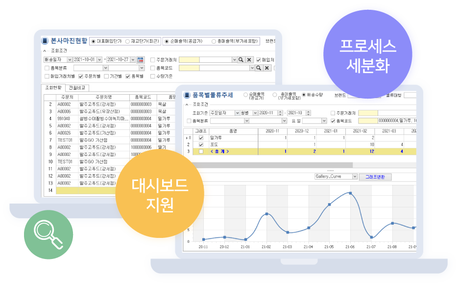 물류 및 배송흐름, 가맹점관리, 미수금관리, 손익분석 등
